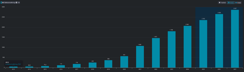 Bild: EVO Omsättning per helår 2015 – 2024 samt estimat 2025-2027 (Källa: Börsdata)