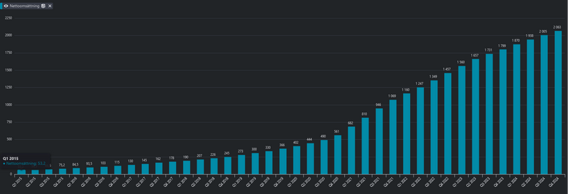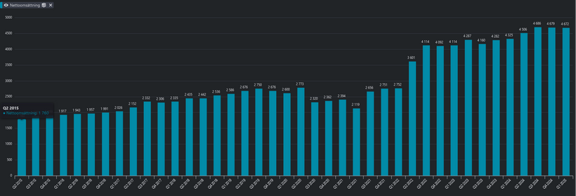 Vi ser hur år för år har omsättningen växt på, faktum är att bolaget har inte haft ett enda kalenderår där omsättningen sjunkit från föregående under perioden vi tittar på.