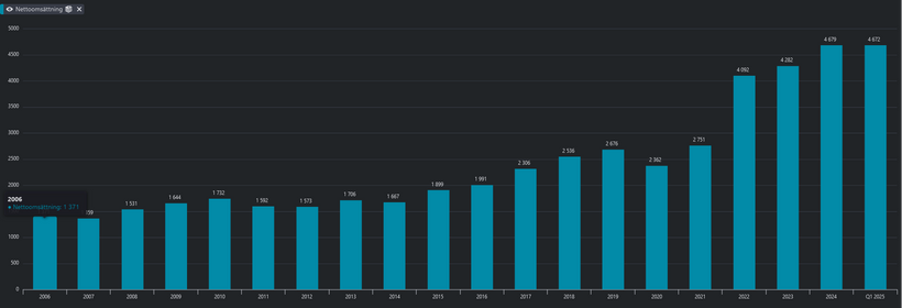 Bild: Omsättning Helår 2006 – Q1 2025 Skistar (Källa Börsdata)