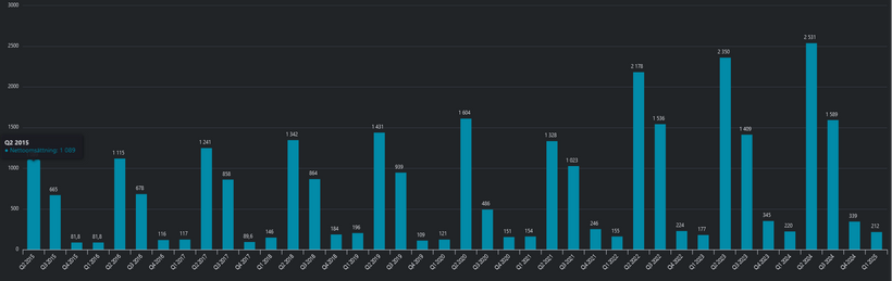 Bild: Skistar Omsättning per kvartal Q2 2015 – Q1 2025 (Källa: Börsdata)