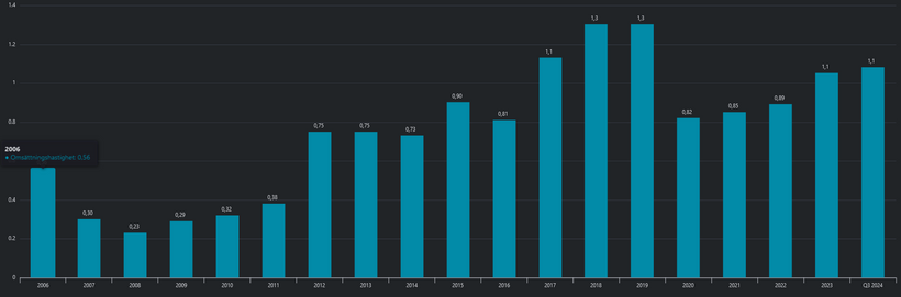 Omsättningshastighet är centralt för bolagets lönsamhet & ett mått på effektivitet. Vi vill helst se stabil och ökande omsättningshastighet, och att den är högre än marknaden och liknande bolag, vilket kan indikera en ekonomisk vallgrav.