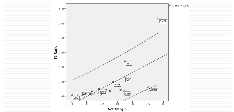 Vad ser vi ovan? Det är en ”plottning” av P/S (jag vet) mot vinstmarginalen. Vi kan se ett positivt samband mellan de två : Ju mer lönsamt bolag desto högre multipel, vilket är logiskt konsekvent.