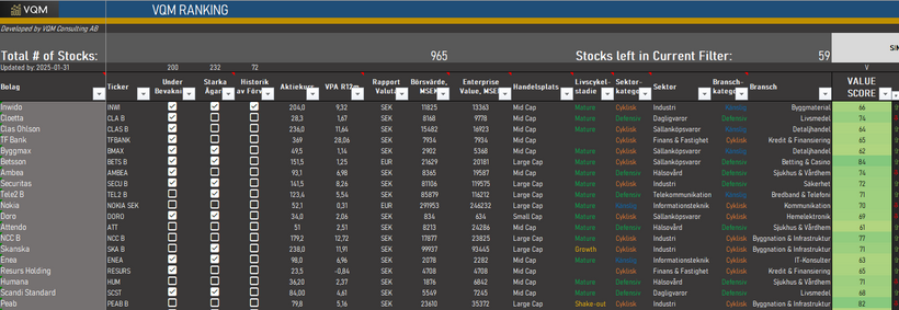 Bild: Rangordning av aktier med hjälp av multiplar och dess determinanter (Källa: VQM)