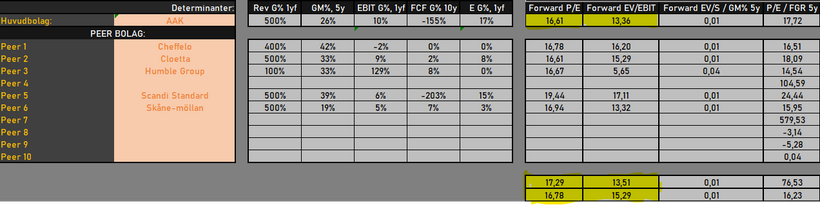 Vi använder vårt verktyg som skickas med i veckobrevet och kikar på framåtblickande PE & EV/EBIT. Justerat för determinanter får vi en genomsnittlig peer-värdering på 318 SEK.