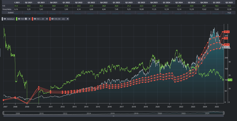 Att ett bolag är välskött, har en sund strategi och visar finansiella muskler räcker sällan som ensam investeringskompass – frågan är vad man faktiskt betalar för allt detta. I värderingsavsnittet sätter vi luppen på aktiens prislapp: vad antyder kassaflödena, multiplarna och scenarierna om det framtida värdet? Genom att kombinera diskonterade kassaflöden med relativvärdering och historiska nyckeltal försöker vi komma närmare ett rimligt spann – från pessimistens botten till optimistens topp.
