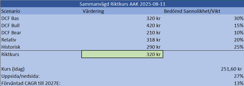 För AAK får vi fram en sammanvägd riktkurs om 320 SEK per aktie, eller en uppsida på 27%. Det innebär en teoretisk CAGR på 13% per år fram till slutet 2027E. Det är fullgott för ett Stable Dividend Case med Buy-and-hold-kvaliteter.