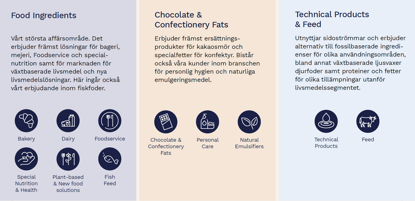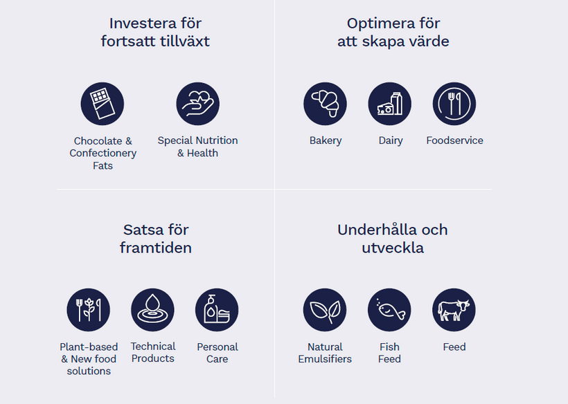Under det gångna året har segmenten inom kategorierna Investera och Optimera uppvisat stark utveckling, särskilt drivet av efterfrågan inom Chocolate & Confectionery Fats, Bakery, Dairy och Foodservice. Den årliga strategigranskningen indikerar att portföljstrategin hittills har fungerat väl, vilket möjliggjort en snabbare implementering av bolagets strategiska initiativ i respektive portföljområde.