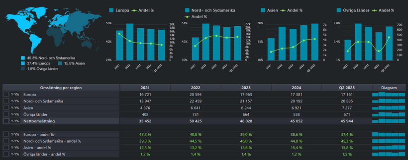 Under senare år har även Asien vuxit som marknad (t.ex. cirka 6,9 md SEK i försäljning år 2024). Sammanlagt står Europa och Nord- och Sydamerika för huvuddelen av omsättningen, medan stark tillväxt förväntas i Asien och Latinamerika framöver.