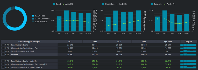 Under 2025 väntas tillväxten bli svag, bland annat på grund av det höga kakaopriset som dämpar volymer i Chocolate & Confectionery Fats samt effekten av försäljningen av den amerikanska Hillside-anläggningen.
