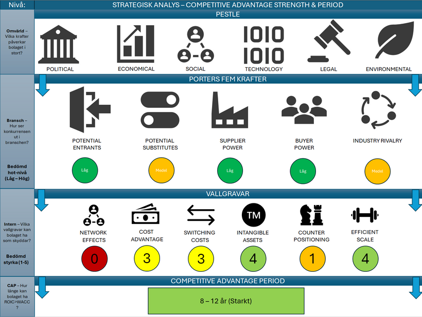 AAK har en stark vallgravsprofil med flera källor till uthålliga konkurrensfördelar, bland annat tekniskt avancerade produktlösningar, långvariga kundrelationer och höga inträdesbarriärer inom specialfetter. Detta skapar goda förutsättningar för att fortsätta leverera avkastning på kapital klart över kapitalkostnaden även på lång sikt.
