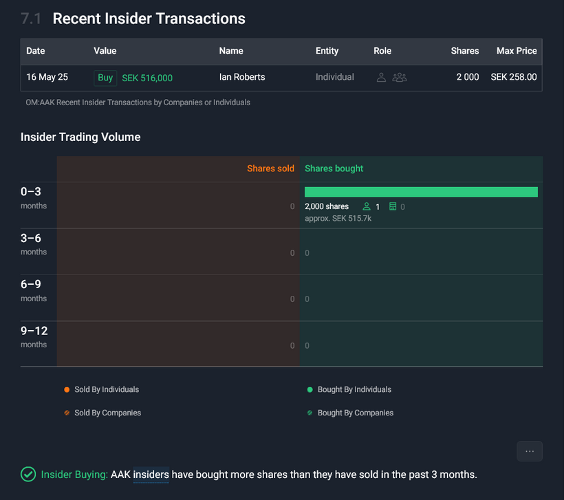 Kortfristiga triggerfaktorer (1 år): Bland annat kan förväntan om att råvarupriser (t.ex. palmolja och vegetabiliska oljor) planar ut leda till marginell återhämtning. AAK:s prisförmåga i chokladsegmentet (ett redan gynnsamt område) kan stärka resultatet under kommande kvartal. Vidare väntas en ny rapportperiod där utdelningen ökar (5,00 SEK/aktie) och lönsamhetsmålen prognostiseras att uppfyllas ge positiv signal. Eventuella ytterligare kostnadsbesparingar och effektiviseringar i produktionen kan också förbättra resultatet snabbt.