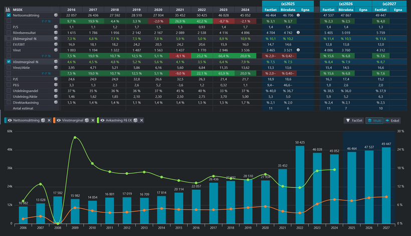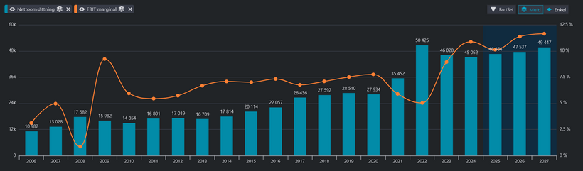 För 2027E räknar vi med en omsättning kring 49,5 MDSEK och en rörelsemarginal runt 11,5%, i linje med Factset, Börsdata & PinPoint.
