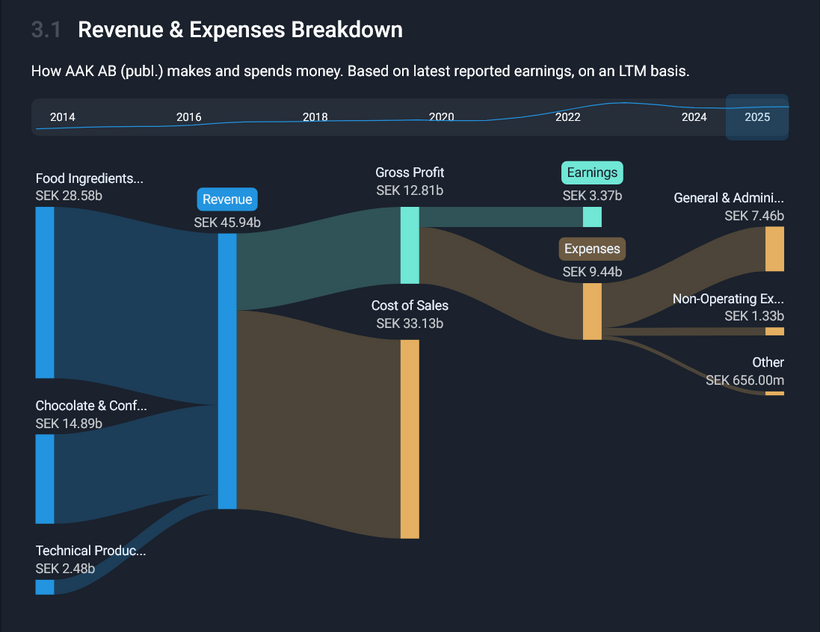 Det mest lönsamma segmentet per kilo. Här erbjuder AAK avancerade alternativ till kakaosmör och andra specialfetter som används i choklad och konfektyr för att ge rätt smälttemperatur, textur och glans. När kakao- och kakaosmörpriser stiger ökar efterfrågan på tekniska alternativ och substitut, vilket historiskt har gynnat AAK:s marginaler i detta segment. Samtidigt är efterfrågan i slutändan beroende av konsumenternas köpkraft och chokladkonsumtion — höga priser på råvara kan både driva penetration av ersättningsprodukter och dämpa total konsumtion, vilket ger dubbelriktad påverkan.