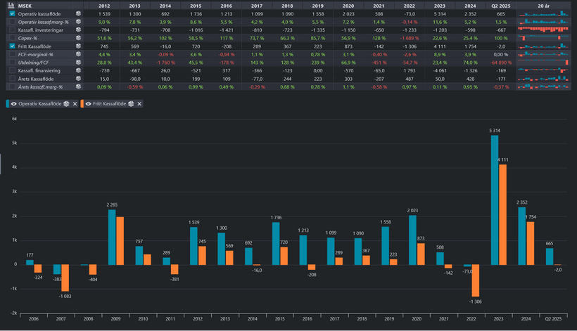 Kassaflödet är tillfälligt svagt, främst på grund av att högre råvarupriser binder mer rörelsekapital. Även om detta inte förändrar den långsiktiga finansiella styrkan, kan det kortsiktigt begränsa flexibiliteten.
