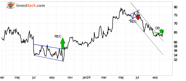 Nilörngruppen B har brutit upp genom taket i en fallande trendkanal på medellång sikt. Det indikerar i första skedet en svagare nedgångstakt eller en mer horisontell utveckling. Aktien har brutit en dubbelbotten-formation. Etablerat genombrott på motståndet vid 64.80 kronor signalerar om en uppgång till 66.80 kronor eller högre. Aktien har stöd vid cirka 62.80 kronor och motstånd vid cirka 79.50 kronor. Aktien är totalt sett tekniskt positiv på medellång sikt.