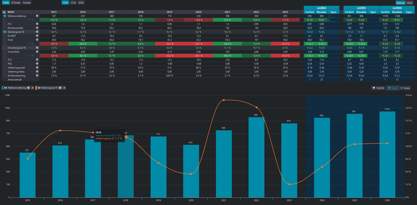Här räknar vi kallt med att rörelsemarginalen återgår till sitt historiska snitt och att ekonomin tar fart igen för 2025 & 2026. Bolaget levererar en tillväxt i linje med sitt mål om 7%, dock påverkar detta kassaflödet negativt kommande 3-4 år. Vi följer i mångt och mycket konsensus-estimaten. Vi räknar dock med att fabriksbygget i Bangladesh tar lite längre tid än kommunicerat, samt räknar med en höjning av notan på ca 20%.