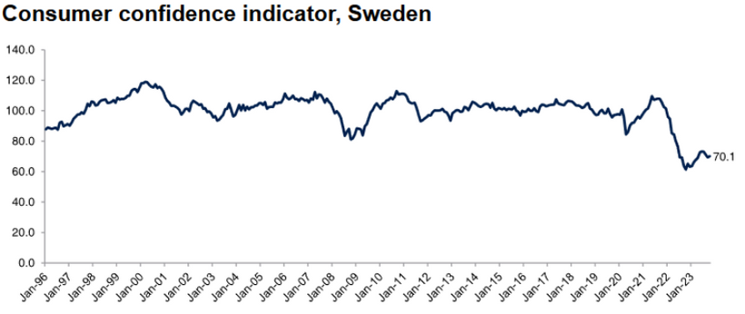 Utöver svårigheten med att slå de dopade siffrorna från 2021 – 2022 ser vi att den svenske konsumenten inte haft så dåligt förtroende för ekonomin på många år (lägsta noteringen sedan 1996, vilket är så långt bak vi hittat statistik för CCI).