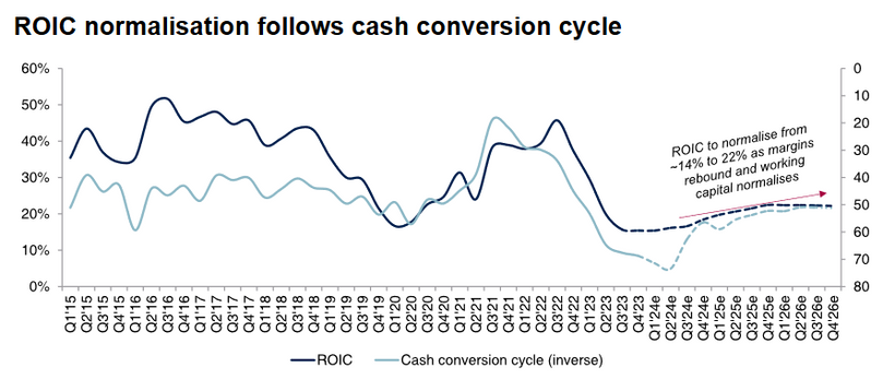 Dessa faktorers samverkan leder till att konsensus-tillväxt för vinst per aktie 2024E landar på hela 52,5% och hela 30% för 2025E, med en förväntan på att tillväxten återgår till ensiffriga tal 2026E.