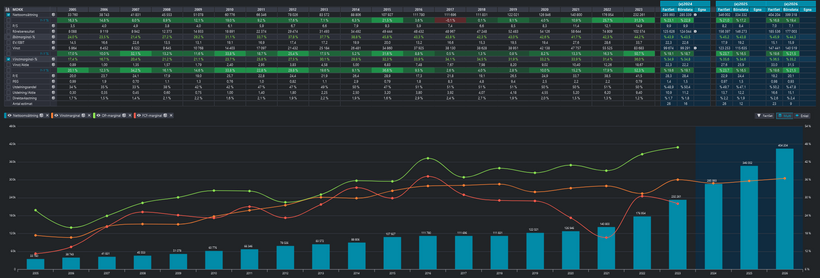 Vinstmarginal: Vinstmarginalen har också varit imponerande, med en ökning från 17 % (2005) till 31,6 % (2022). Detta indikerar en välskött verksamhet med högt fokus på lönsamhet. Förväntningarna framåt visar att marginalerna kommer att stabiliseras kring 35 %.