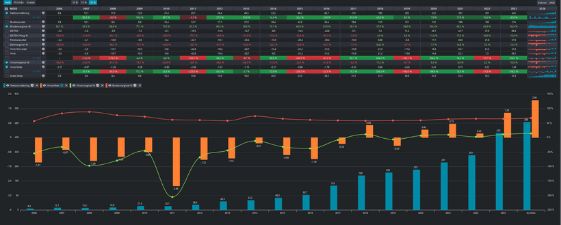 - Bruttomarginal: Under 2006–2012 varierade marginalen mellan 50–70 %, men har sedan dess stabiliserats på högre nivåer och låg 2023 på 64,6 %. Detta visar på en robust affärsmodell som genererar starkt värde från försäljning.