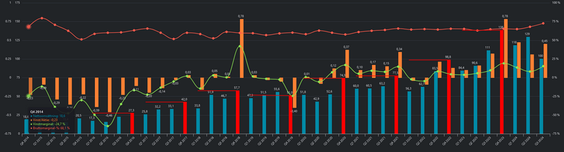 - 2006–2012: Perioden präglades av förlustår med negativa vinstmarginaler, ofta över -50 %. Detta speglar bolagets stora satsningar på att etablera sig på marknaden.