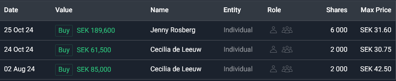 Senaste kvartalet har vi sett mindre köp från VD Cecilia de Leew vid två tillfällen, samt en ökning av innehavet hos styrelseledamot Jenny Rosberg.