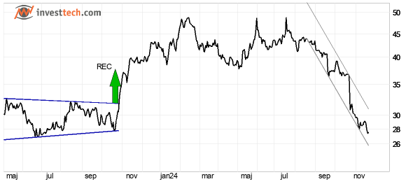 C-RAD B ligger i en fallande trendkanal på medellång sikt. Det visar att investerare över tid har sålt till stadigt lägre kurser för att komma ut ur aktien, och indikerar en negativ utveckling för bolaget. Aktien har marginellt brutit ned genom stödet vid cirka 27.70 kronor. Etablerat brott indikerar vidare nedgång. Negativ volymbalans indikerar att säljarna är aggressiva medan köparna är passiva, och försvagar aktien. Det kortsiktiga momentumet i aktien är starkt negativt, med RSI under 30. Det indikerar ökande pessimism hos investerare och ytterligare kursnedgång för C-RAD B. Aktien är totalt sett tekniskt negativ på medellång sikt.