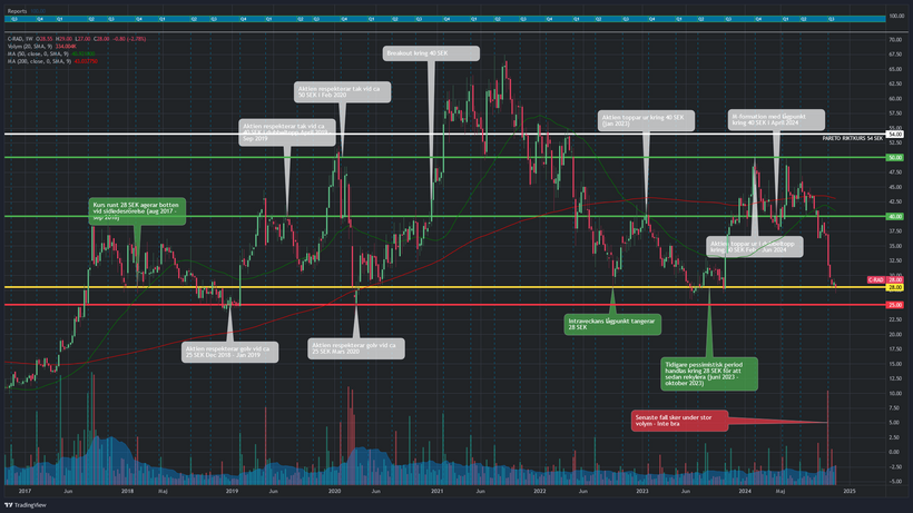 Med aktien i skrivande stund runt 28 SEK per aktie ser vi att det agerat stöd tidigare, med nästa golv runt 25 SEK per aktie. Vi ser även ett motstånd vid 40 SEK per aktie & 50 SEK per aktie. Det som talar för att aktien potentiellt bryter ned genom 28 ner till 25 SEK är att senaste nedgången skett under stor volym.