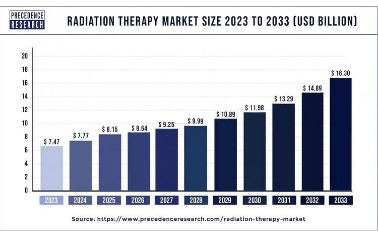 Globala strålterapi-marknaden estimerades till 7,47 Md USD 2023 och förväntas nå 16,3 Md USD 2033 vilket är en CAGR på 8,58% globalt enligt Precedence Research.