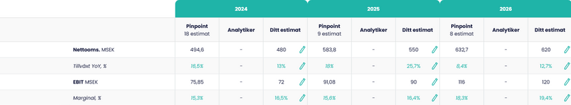 Då jag är väldigt ovan i denna sektor kollar jag även estimat på Pinpoint, där jag även lagt mina egna estimat (kommer lägga in dessa i Börsdata med).