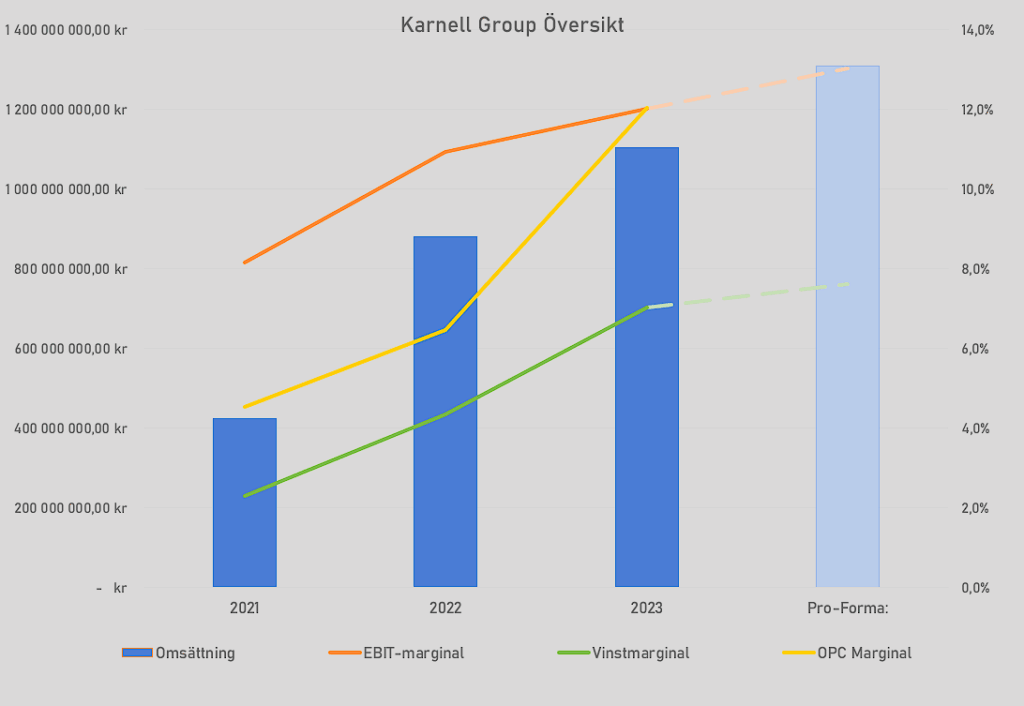 Karnell (med teckningskurs på 26-30 kr) är en bolagsgrupp som grundades år 2016 och fokuserar på förvärv och ägande av små till medelstora industri- och produktionsbolag. För närvarande består koncernen av tolv operativa bolag uppdelade i två affärsområden: Produktbolag (sju bolag) och Nischproduktion (fem bolag). Historiskt sett har Karnell förvärvat i genomsnitt två bolag per år. Dotterbolagen har enbart B2B-fokus. På pro forma-basis genererar koncernen en årlig omsättning på över 1,3 miljarder kronor med en EBITA-marginal på 14%. Sammantaget har koncernen mer än 535 anställda och har sitt huvudkontor i Stockholm. Den övervägande delen av försäljningen sker i euro, men svenska kronan är också en betydande valuta för Karnell. Under 2023 utgjorde ingen enskild kund mer än 5% av koncernens totala omsättning. Traditionellt sett är det andra och fjärde kvartalet på året de säsongsmässigt starkaste perioderna när det gäller både omsättning och resultat.