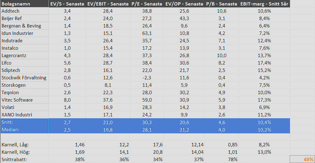 Givet svårigheten i att bedöma huruvida marknaden kommer att värdera Karnell Group mer likt de mer premie-värderade serieförvärvarna (Addtech, Lifco, Lagercrantz) eller de mer ifrågasatta (Storskogen, Stockwik) gör vi en jämförelse med samtliga närliggande bolag.
