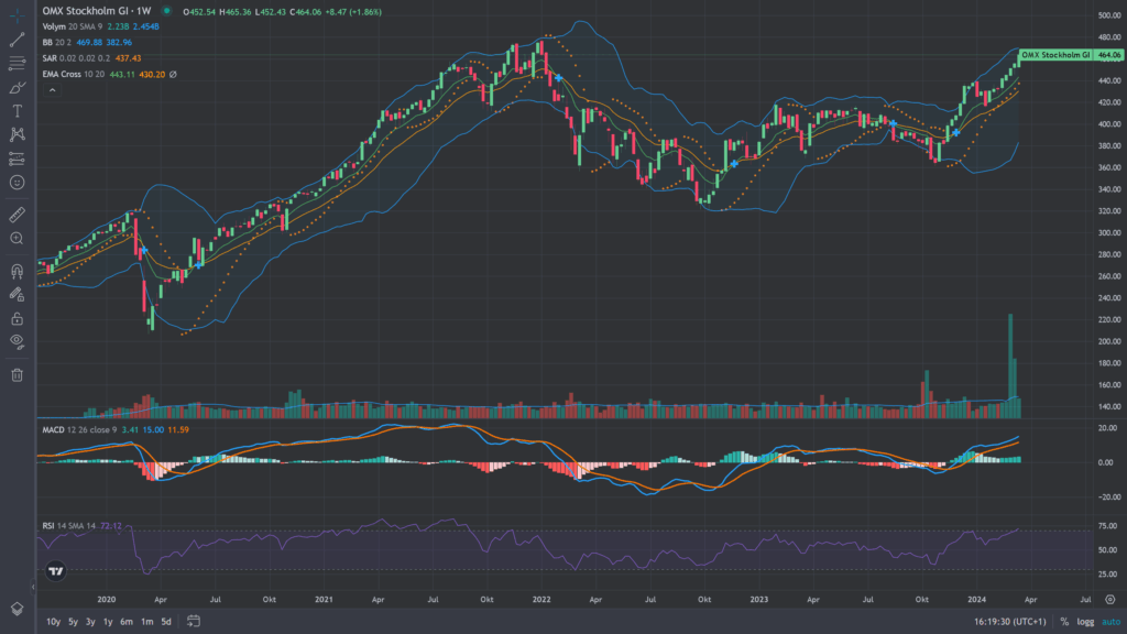 Stockholmsbörsen bottnade ur under hösten 2023, och sedan årsskiftet har vi sett en fantastiskt god avkastning. Vi närmar oss All-time-high nivåer på OMXSGI, och har redan brytit genom den gränsen för storbolagen i OMXS30.