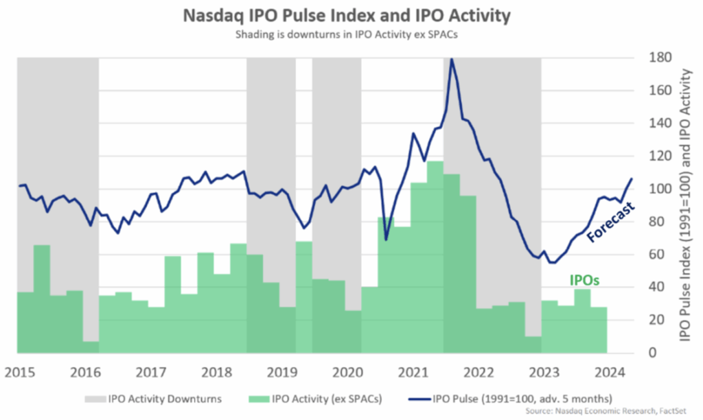 Med lite bredare mått mätt kan vi titta på det nyutvecklade NASDAQ IPO Pulse Index, ett framåtblickande index för att mäta klimatet för börsnoteringar.