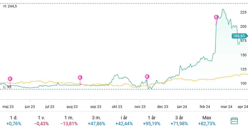Bild: Yubico aktiekurs (grön) sedan analysen (19e April 2023) i jämförelse med index (gul)