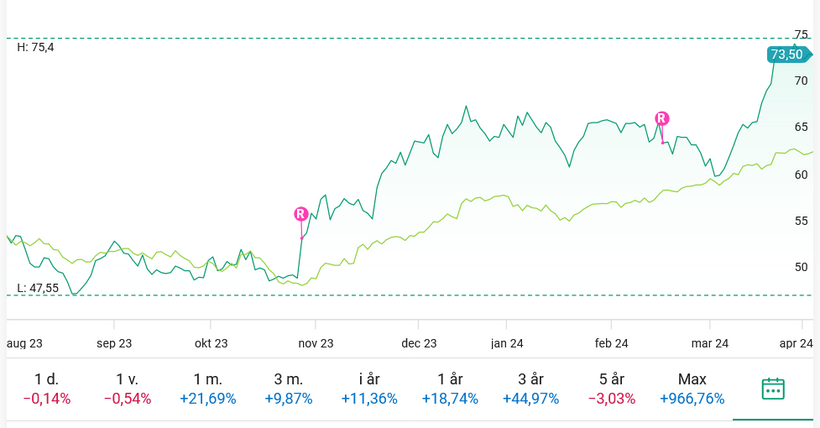 Bild: Utveckling Fagerhult (Mörkgrön) mot OMXSGI (Ljusgrön) sedan 1a Augusti 2023. R står för rapport.