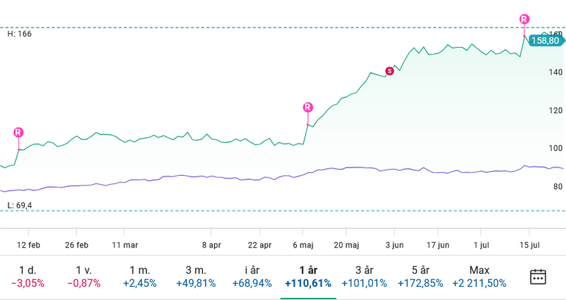 Bild: Kursgraf från 3e februari till skrivande stund Proact IT Group (Källa: Avanza). R står för rapport.