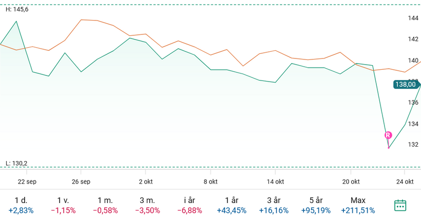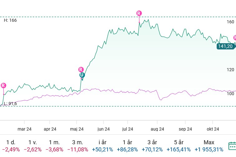 Sedan initiala analysen är aktien upp 60,51% kontra OMXSGI på 14,44%. Vid uppdateringen 24e Juli 2024 skrev jag att jag halverade mitt innehav på 158 SEK per aktie, och det blev helt rätt val. Aktien har handlats ganska jämnt mellan 145 – 160 SEK per aktie, för att sedan glida ner mot dagens kurs på 141 SEK.