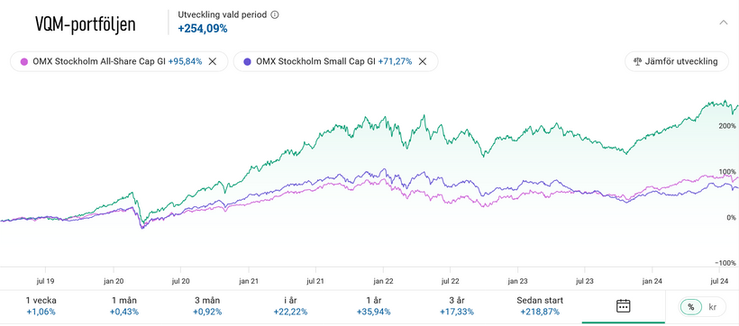 Bild: Utveckling VQM-portföljen sedan start (2019-02-27) mot OMXSGI (lila) & OMXS Small Cap GI (blå)