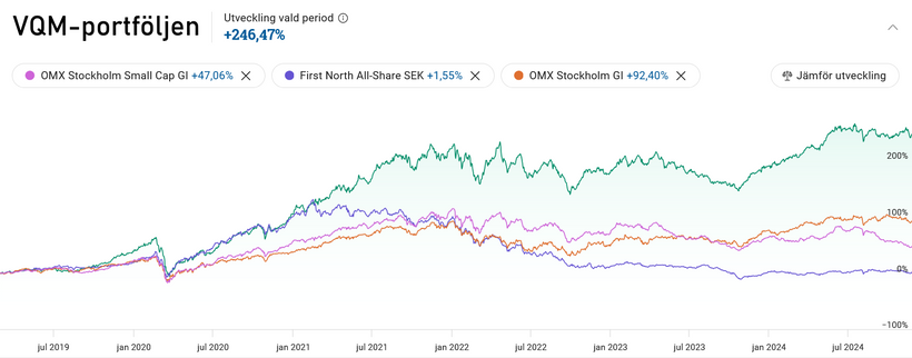 Bild: Utveckling VQM-portföljen sedan start (2019-02-27) mot OMXSGI (orange) , OMXS Small Cap GI (rosa), & First North All-Share (lila)